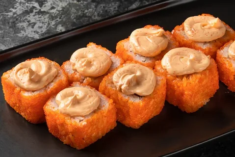 Саппоро ролл - это изысканное блюдо японской кухни, которое состоит из нежного лосося, жаренного в тесте, и крем-сыра, завернутых внутрь риса и нори. Ролл декорируется красным имитационным икрой тобико и остреньким соусом спайси.